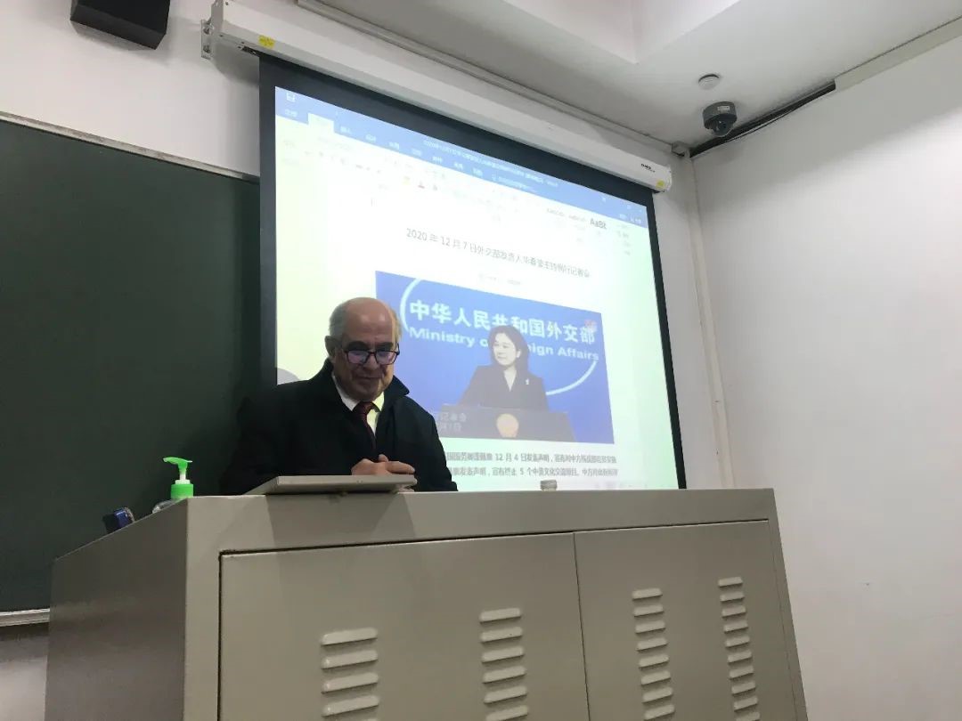 2020年12月9日上午,博鱼网页版阿拉伯语系课程集群思政进课堂系列讲座邀请了阿拉伯信息中心主任、曾任教于北京大学阿拉伯语系的前巴勒斯坦驻华大使穆斯塔法•萨法里尼先生来到教室为同学们讲课。本次讲座由阿拉伯语系袁琳老师主持,林丰民教授评议。