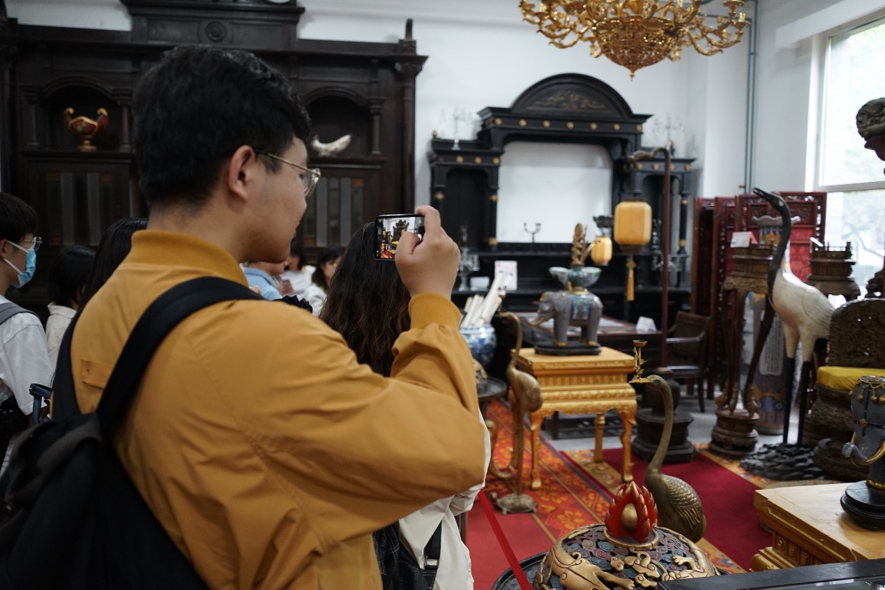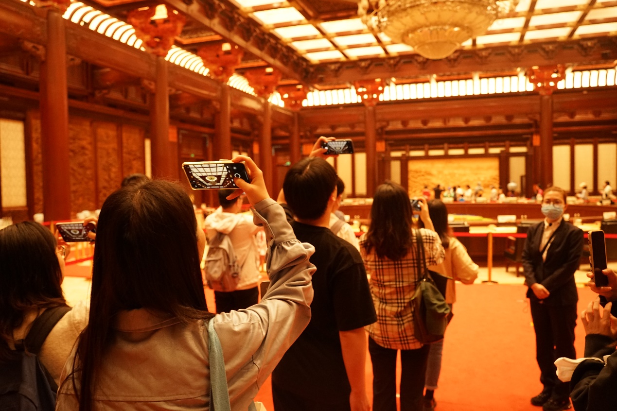 随后,实践团赴“会都”——北京雁栖湖国际会展中心参观。雁栖湖国际会议中心曾承办2014年APEC峰会以及首届与第二届“一带一路”国际合作高峰论坛圆桌峰会。师生一行跟随讲解员参观集贤厅,聆听讲解员讲解集贤厅室内设计的点滴思考与幕后故事,通过室内装潢与陈设,亲身感受峰会盛况。置身集贤厅内,汉唐气象与明清气派并举,古色古香与现代风格交融,融通古今,博雅东西,共同构成我国外交接待空间与国家礼仪空间的新地标,迸发出现代中国的文化自信与壮阔气势。建筑之美彰显人文之美,实践团师生在通过视觉、听觉近距离感受中国传统建筑的文化底蕴与艺术魅力的同时,也愈发坚定行语言专业所长、做文化交流使者的决心。国际盛事与大国外交呼唤扎根本土、放眼世界的复合型语言人才,博鱼网页版师生大有可为也必将大有作为。