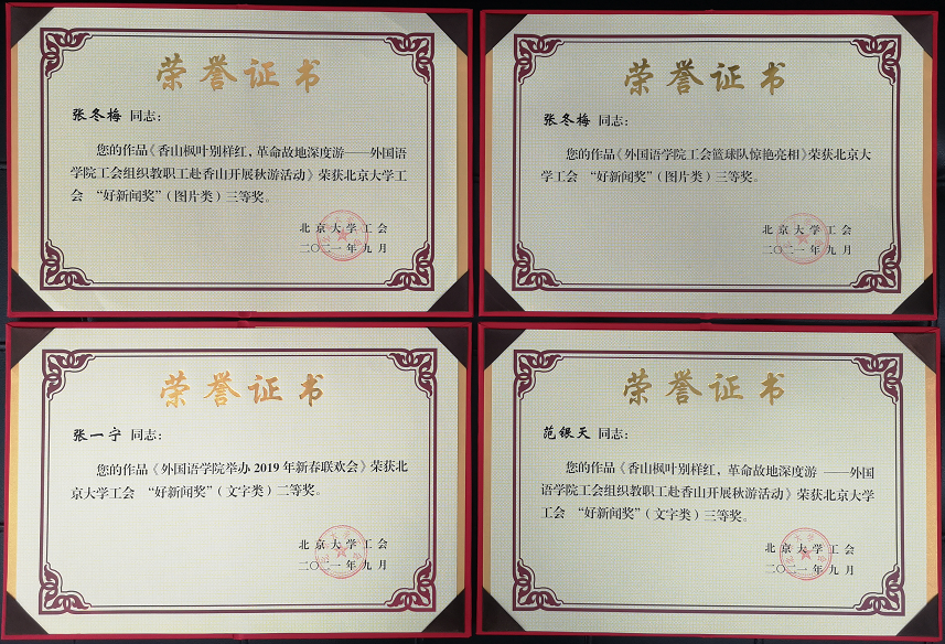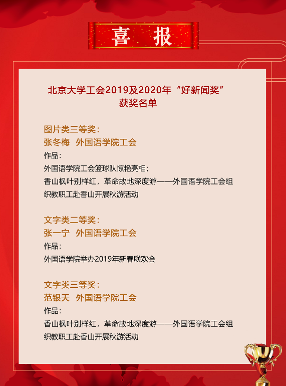 9月22日下午,工会2019及2020年“好新闻奖”评审会在老生物楼108会议室召开。党委宣传部文化办、校报、新闻网、电视台的负责同志应邀担任评委。博鱼网页版张冬梅老师的作品“博鱼网页版工会篮球队惊艳亮相”和“香山枫叶别样红,革命故地深度游——博鱼网页版工会组织教职工赴香山开展秋游活动”获图片类三等奖;张一宁老师的作品“博鱼网页版举办2019年新春联欢会”获文字类二等奖;范银天老师的作品“香山枫叶别样红,革命故地深度游 ——博鱼网页版工会组织教职工赴香山开展秋游活动” 获文字类三等奖。