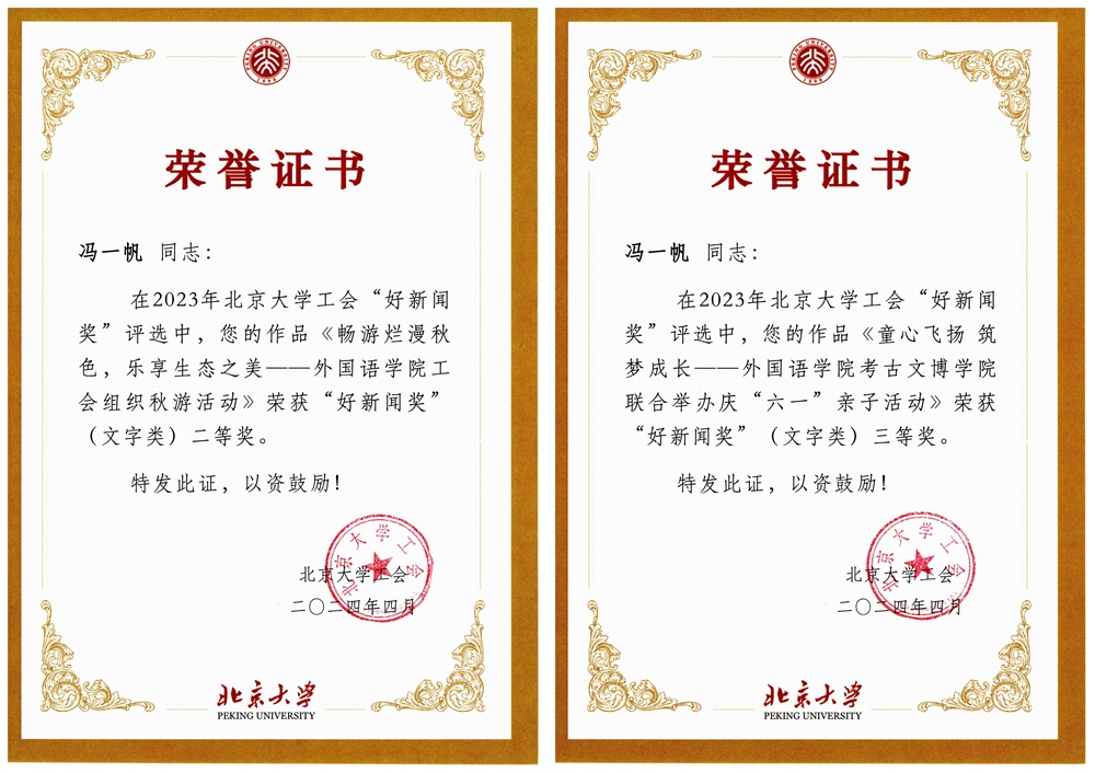在2023年北京大学工会“好新闻奖”评选中,校工会邀请专家评委,结合工会工作特点,从新闻题材、宣传效果、稿件可读性与写作规范、图片视觉冲击力与信息含量等方面,对参评稿件和图片进行了逐一评议。外院工会会员冯一帆老师的图片作品“童心飞扬 筑梦成长”荣获“好新闻奖”(图片类)一等奖、工会主席张冬梅老师的图片作品“巾帼迈进,竞绽芳华” 荣获“好新闻奖”(图片类)三等奖。冯一帆老师的新闻作品“畅游烂漫秋色,乐享生态之美——博鱼网页版工会组织秋游活动”和“童心飞扬 筑梦成长——博鱼网页版考古文博学院联合举办庆‘六一’亲子活动”分别荣获“好新闻奖”(文字类)二等奖、三等奖。