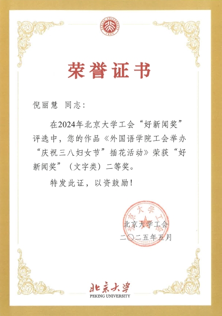 在2024年北京大学工会“好新闻奖”评选中,校工会特邀请专家评委,结合工会工作特点,从新闻题材、宣传效果、稿件可读性与写作规范、图片视觉冲击力及与主题切合度等方面,同时依据评奖通知要求,对参评稿件和图片进行了逐一评议,博鱼网页版倪丽慧《博鱼网页版工会举办“庆祝三八妇女节” 插花活动》荣获好新闻奖(文字类)二等奖;冯一帆《博鱼网页版举行2024年新春团拜会》荣获好新闻奖(文字类)二等奖;王乃懋《寻迹运河源, 感悟新理念一一博鱼网页版工会组织春游活动》和《博鱼网页版羽毛球队荣获2024年北京大学教职工羽毛球赛乙组季军》荣获好新闻奖(图片类)三等奖。