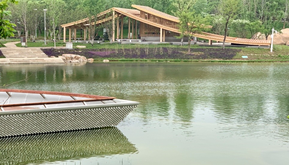 另有一些老师选择去国际馆参观。国际馆由94把巨型花伞构成,如同一片白色的花海飘落园区,且与游客手中的各色雨伞动静结合、相映成趣。这些擎天花伞不仅美观奇特,在这风雨交加的时刻,还能为我们遮风挡雨。据说,花伞的立柱可收集屋面雨水,使其渗入蓄水池。当雨水过多时,将会流入排水沟,用于景观用水、绿化用水、路面冲洗等。