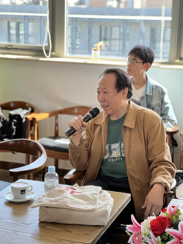 随后,在博鱼网页版咖啡书苑,赵振江老师与师生们座谈,分享自己的翻译生涯与感悟。他说这是一个难得的机会,让他能对自己的翻译生涯做一个简单的梳理和回顾。现场放映的一张张图片承载着宝贵的回忆,赵老师生动地讲述了七十年代末八十年代初在墨西哥进修的生活、八十年代末在西班牙格拉纳达大学翻译《红楼梦》时艰苦的工作,以及1995年获得智利鲁文·达里奥“蓝色百年”奖时独特的经历等。赵老师回忆道,为翻译《红楼梦》,他和两位西班牙译者加班加点工作,甚至连周末和圣诞节都没有休息。他翻译阿根廷高乔史诗《马丁·菲耶罗》是纯粹出于兴趣,出于对诗歌的热爱,并未考虑过刊印发行。在时代风云中,它的出版成为了文化外交大事,促进了中阿两国人民相互了解和交流。有阿根廷出版社为赵振江教授印制了《马丁·菲耶罗》专属版。世上仅此一本,独一无二。赵老师娓娓道来,幽默风趣,在座师生如沐春风,不时发出会心的笑声。
