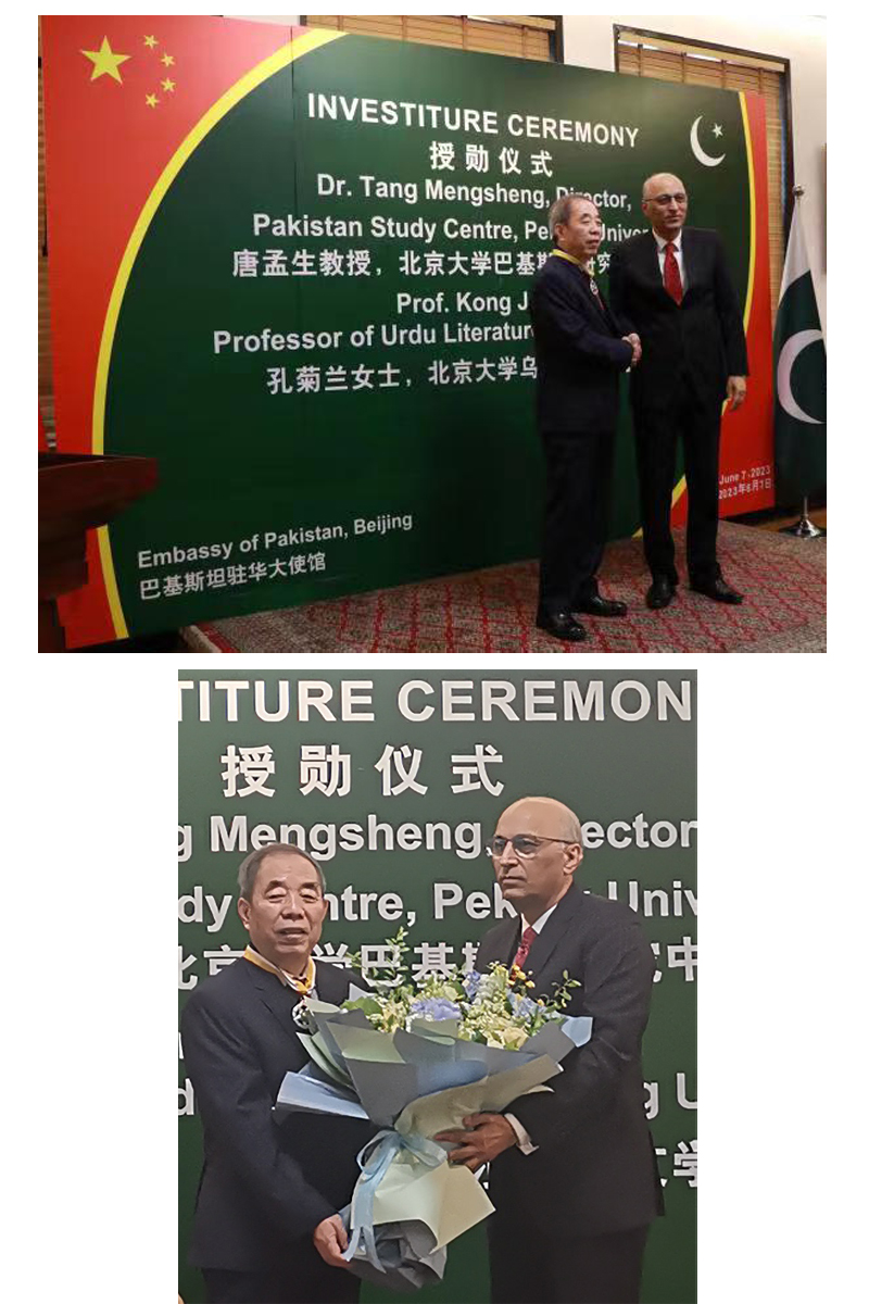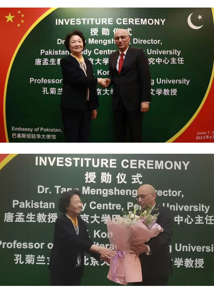 2023年6月7日,巴基斯坦驻华大使馆举办隆重仪式,授予博鱼网页版南亚学系唐孟生教授与孔菊兰教授巴基斯坦“卓越之星”勋章,以表彰两位学者在推动乌尔都语教学、增进两国人文交流、增进中巴友谊方面作出的重要贡献。巴基斯坦驻华大使莫因·哈克、政务参赞穆罕默德·卢曼·艾哈迈德、武官Ranna Faisal Rafiq准将、社会福利公使Ijaz Ahmad、科技公使Kamran Rasheed博士,以及原中国驻(巴基斯坦)卡拉奇总领事安启光、三峡集团财务总监王少峰等各界人士出席了授勋仪式。