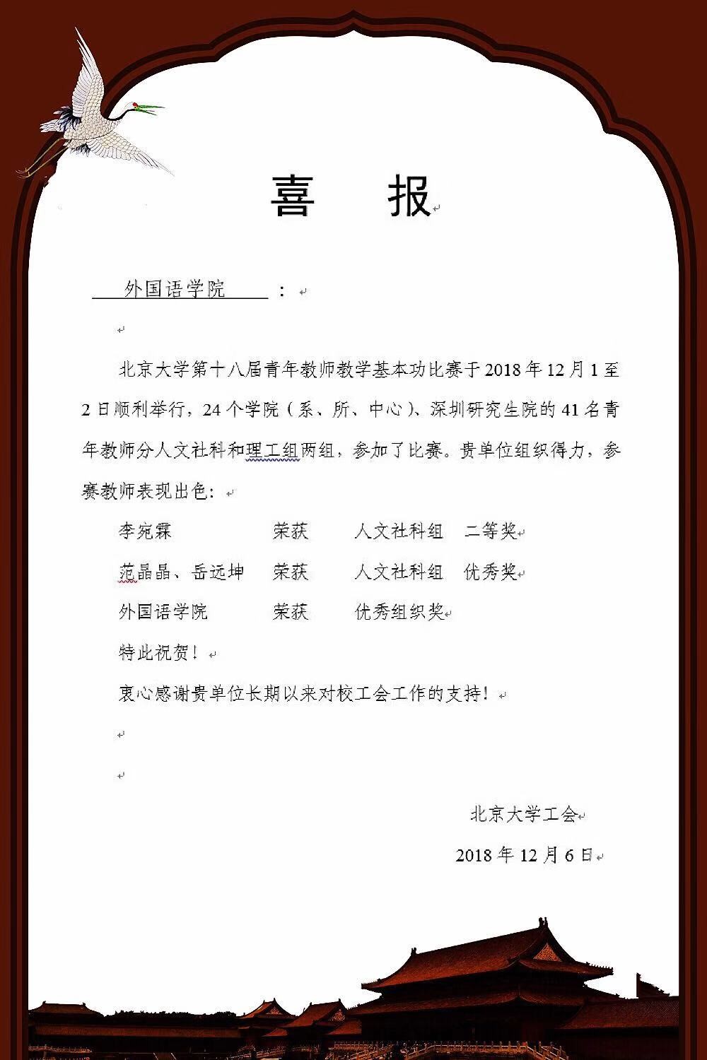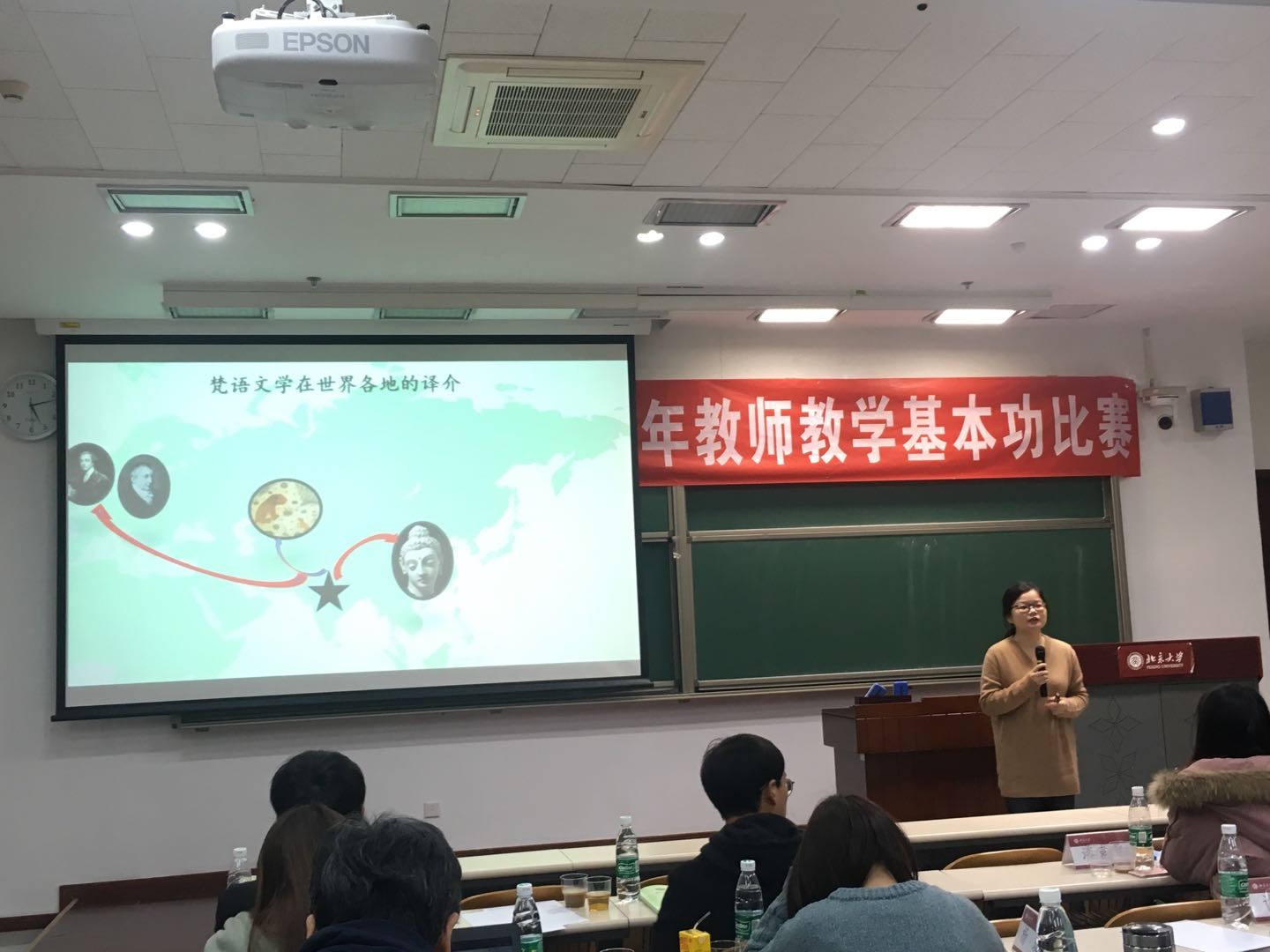 2018年12月1日,北京大学第十八届青年教师教学基本功大赛在理教201教室如期举行。此次教学基本功大赛分为文科、理科两个组别进行比赛。文科组有来自全校15个文科院系的22位老师参赛。博鱼网页版有英语系李宛霖老师、日语系岳远坤老师和南亚系范晶晶老师参加了此次比赛。经过一天的紧张角逐,李宛霖老师的《改编——关于变化的争议》课程展示获得文科组第二名,岳远坤老师《笔译专家指导儿童绘本翻译的原则和方法》课程展示和范晶晶老师的《缘——中印文学交流的个案分析》课程展示获得优秀奖,博鱼网页版获得优秀组织奖。