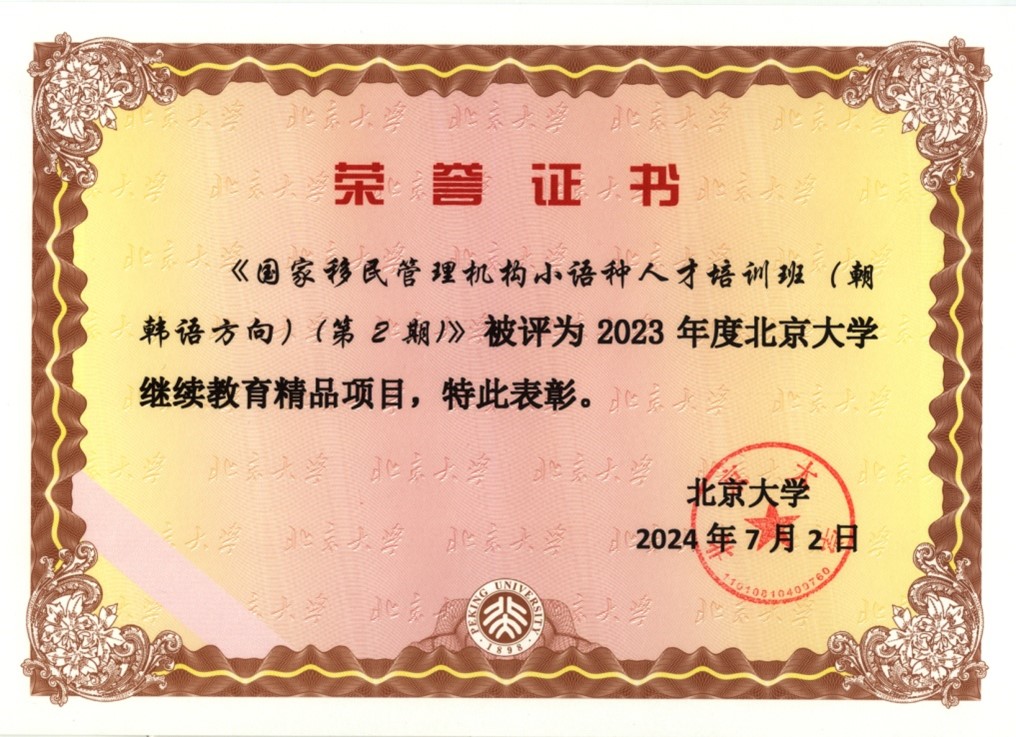 我院举办的《国家移民管理机构小语种人才培训班(朝韩语方向)(第二期)》,项目编号为北大培训20230366号,被评为2023年度北京大学继续教育精品项目。