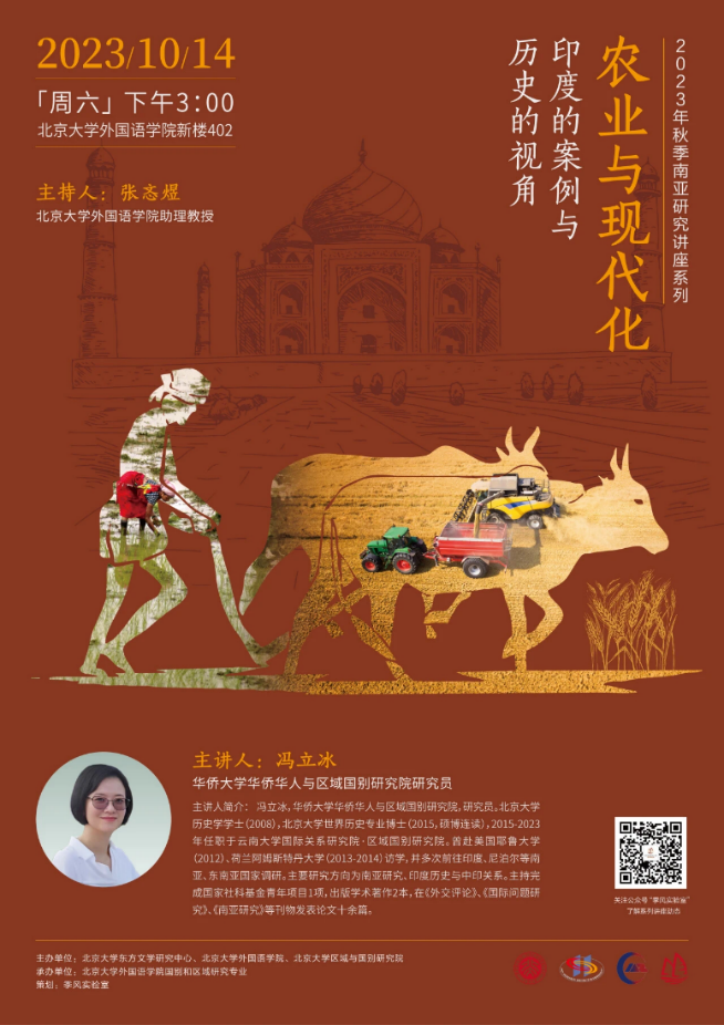 2023年10月14日,华侨大学华侨华人与区域国别研究院冯立冰研究员应邀为我校师生进行题为“农业与现代化——印度的案例与历史的视角”的讲座。本次讲座是由北京大学东方文学研究中心、博鱼网页版和区域与国别研究院主办,博鱼网页版国别和区域研究专业承办的2023年秋季学期南亚研究系列讲座的第二讲。本场讲座由博鱼网页版张忞煜助理教授主持,博鱼网页版东南亚系谢侃侃助理教授出席本次讲座并参与讨论。