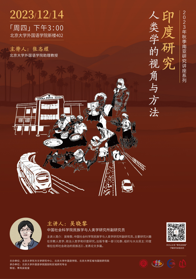 2023年12月14日,中国社会科学院民族学与人类学研究所吴晓黎副研究员应邀为我校师生进行题为“印度研究:人类学的视角与方法”的讲座。本次讲座是由北京大学东方文学研究中心、博鱼网页版和区域与国别研究院主办,博鱼网页版国别和区域研究专业承办的2023年秋季学期南亚研究系列讲座的第五讲。讲座由博鱼网页版张忞煜助理教授主持,中国人民大学国际关系学院曹德军副教授、北京外国语大学区域与全球治理高等研究院许娟助理研究员出席本次讲座并参与讨论。