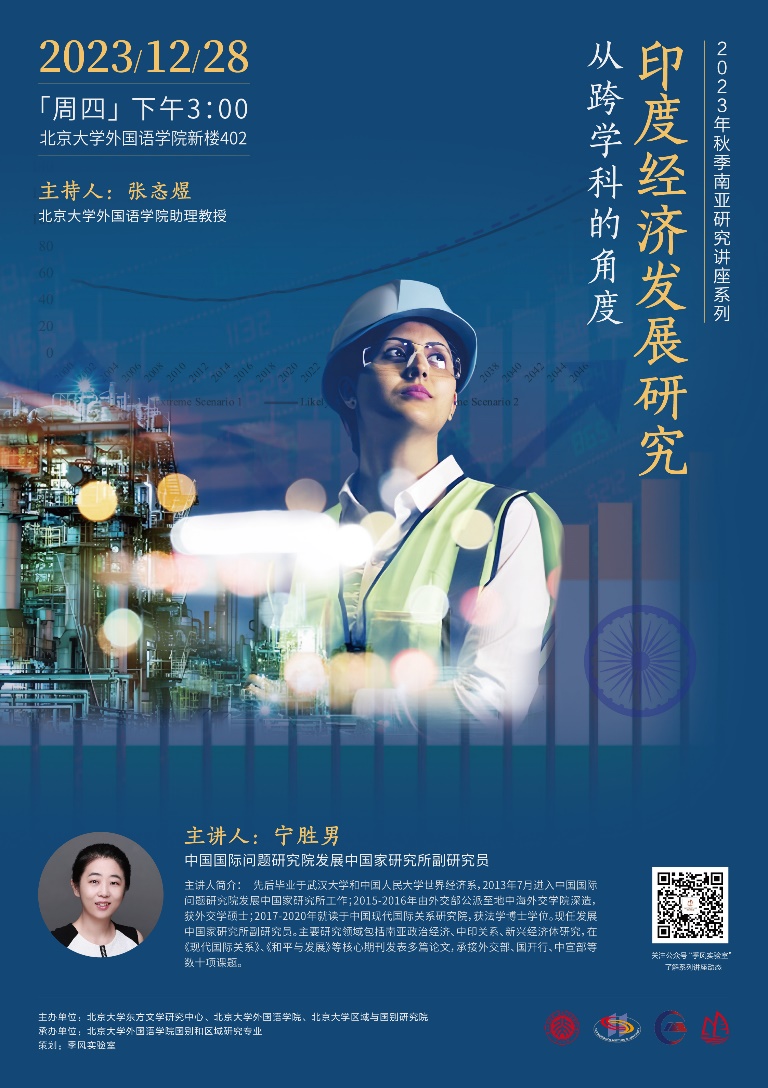 2023年12月28日,中国国际问题研究院发展中国家研究所副研究员宁胜男老师应邀为我校师生进行题为“印度经济发展研究——从跨学科的角度”的讲座。本次讲座是由北京大学东方文学研究中心、博鱼网页版和区域与国别研究院主办,博鱼网页版国别和区域研究专业承办的2023年秋季学期南亚研究系列讲座的第六讲。讲座由博鱼网页版张忞煜助理教授主持,上海外国语大学国际关系与公共事务学院陈金英教授参与讨论。