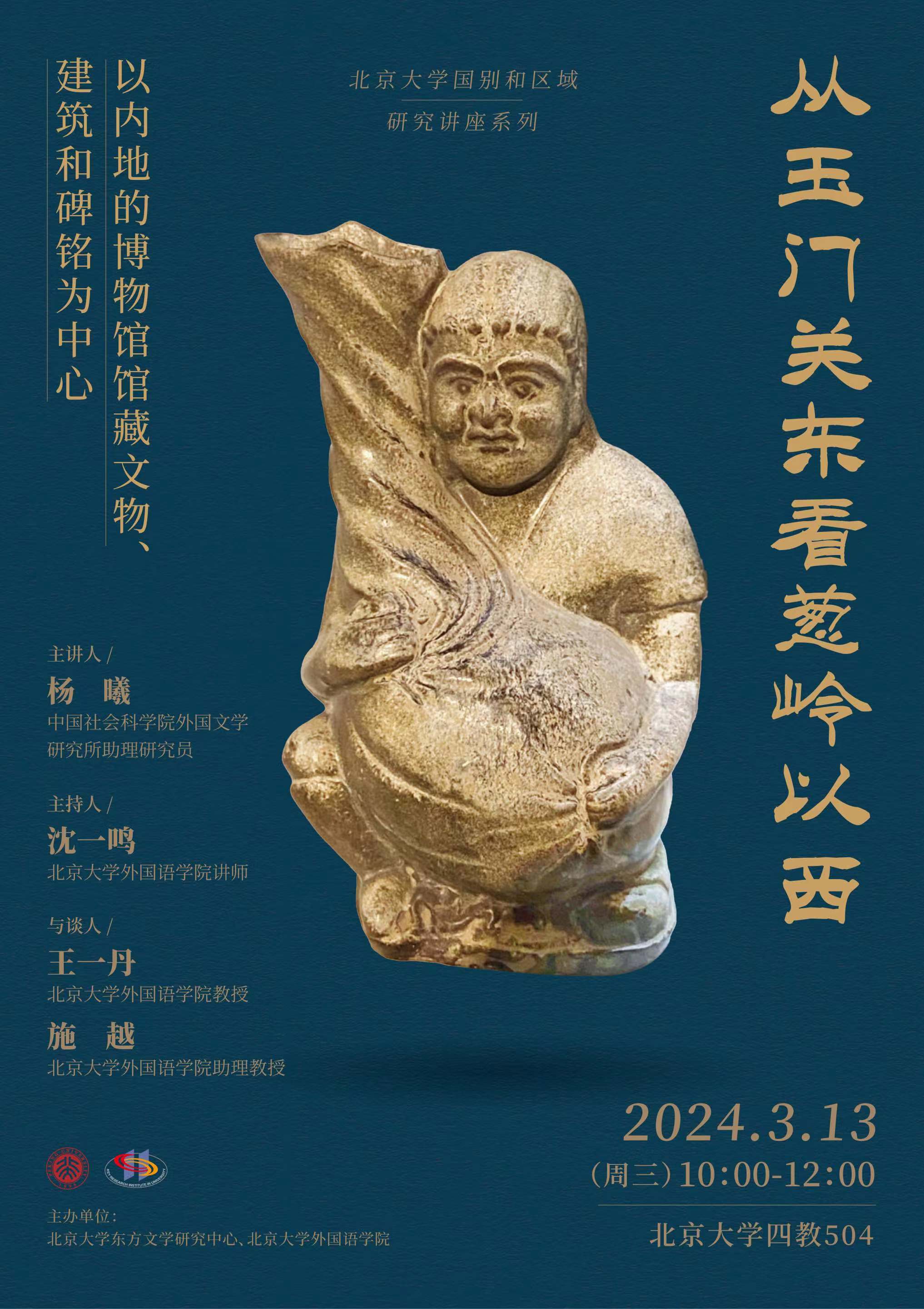 2024年3月13日,由北京大学东方文学研究中心、博鱼网页版主办的“北京大学国别和区域研究”讲座系列“从玉门关东看葱岭以西:以内地的博物馆馆藏文物、建筑和碑铭为中心”在北京大学第四教学楼504教室举行。本次讲座由中国社会科学院外国文学研究所助理研究员杨曦主讲,北京博鱼网页版西亚系沈一鸣老师主持,王一丹教授作为与谈人参与讨论。