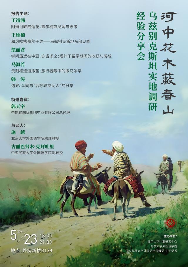 2024年5月23日晚,由北京大学中亚研究中心、博鱼网页版、中央民族大学博鱼网页版俄语—中亚语系主办的“河中花木蔽春山:乌兹别克斯坦实地调研经验分享会”在北京大学外院新楼B134会议室顺利举办。中央民族大学博鱼网页版副教授古丽巴努木·克拜吐里、博鱼网页版国别和区域研究专业助理教授施越出席,来自北京大学、中央民族大学的同学就乌兹别克斯坦实地调研经验进行了报告分享,会议特邀中能建国际集团中亚有限公司总经理郭天宇一同交流讨论。