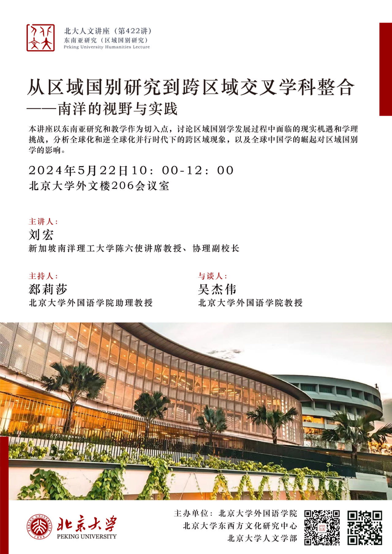 2024年5月22日,新加坡南洋理工大学协理副校长、陈六使讲席教授刘宏做了题为“从区域国别研究到跨区域交叉学科整合——南洋的视野与实践”的讲座。本期讲座是北京大学人文系列讲座的第422讲,由博鱼网页版、北京大学东西方文化研究中心和北京大学人文学部主办,博鱼网页版郄莉莎助理教授主持,博鱼网页版教授吴杰伟受邀担任与谈人。