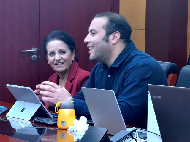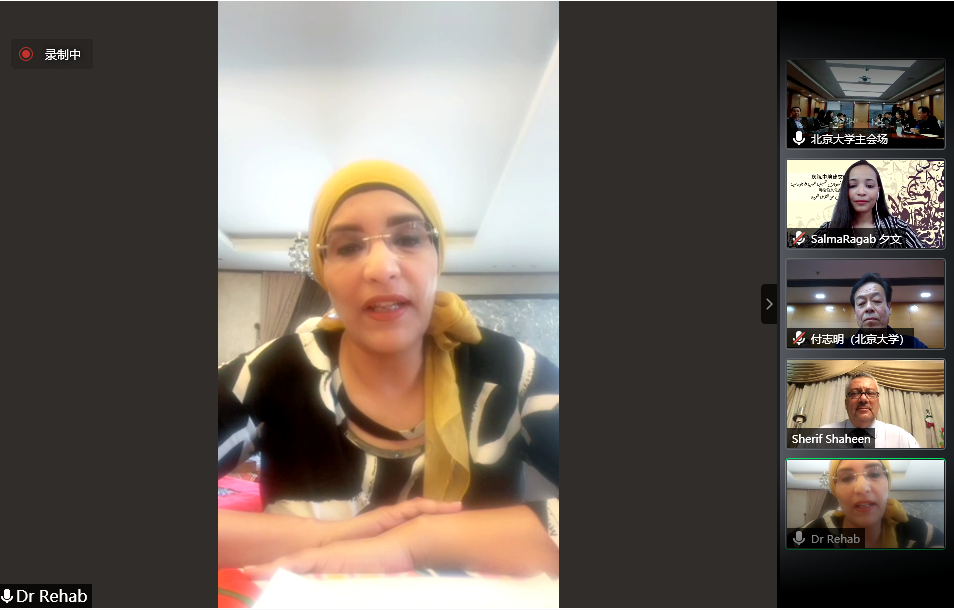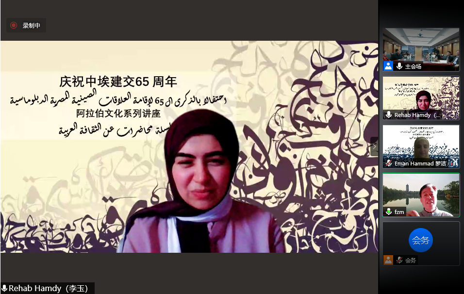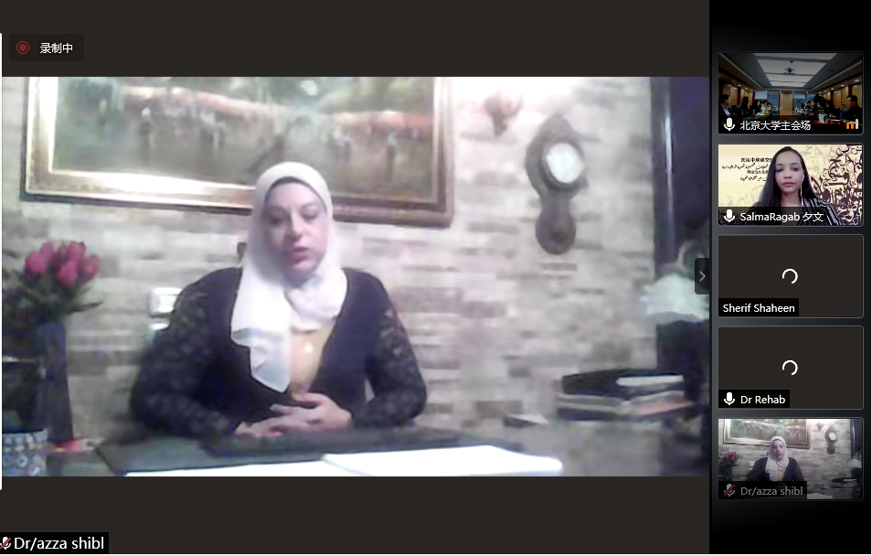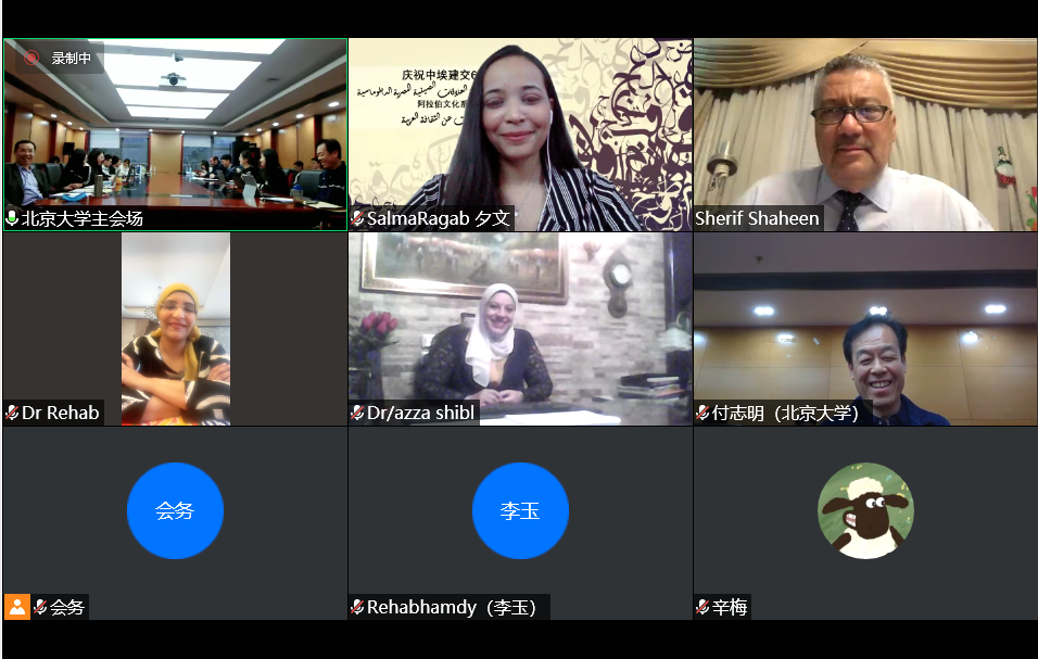 为庆祝中埃建交65周年,继成功举办北京大学与开罗大学“中国文化春令营”活动之后,两校又进行了新一轮的合作,于5月7日至8日联合举办“阿拉伯文化春令营”系列讲座。本次系列讲座线上线下协同进行。出席开幕式的有开罗大学文学院院长谢里夫•沙欣(Sherief Shahin)、文学院中文系主任兼孔子学院院长李哈布(Rehab),文学院阿拉伯语系教授阿扎•席波乐(Azza Shebl),中文系教师李玉(Rehab)、梦洁(Eman)、夕文(Salma),博鱼网页版副院长付志明、阿拉伯语系主任林丰民、叙利亚籍专家哈穆德•优尼斯(Hamoud Younes)、叙利亚籍专家赛米拉•萨拉玛(Samira Salami)、阿拉伯语系长聘副教授廉超群、讲师袁琳、助理教授李海鹏、埃及籍博士后高山(Alaa Mamdouh Akef)及阿拉伯语系40余名学生。