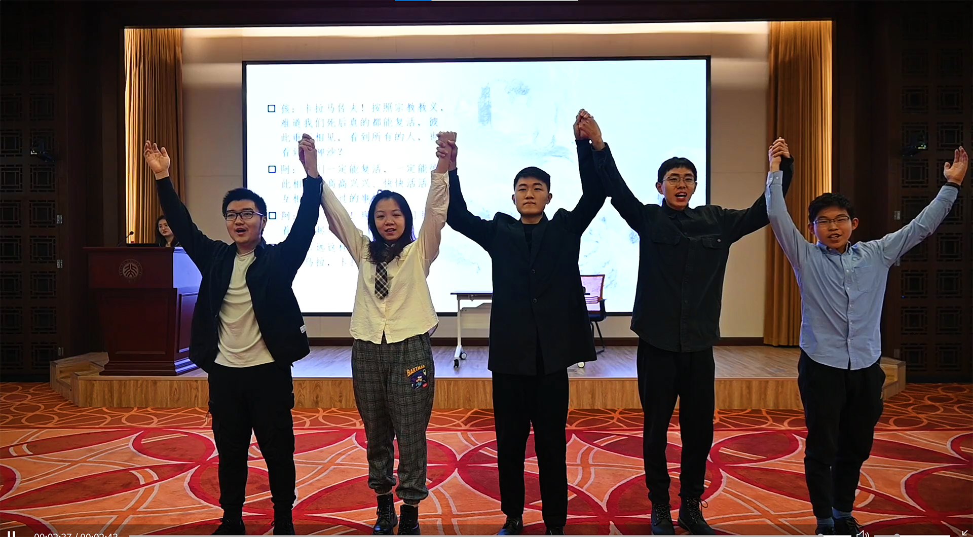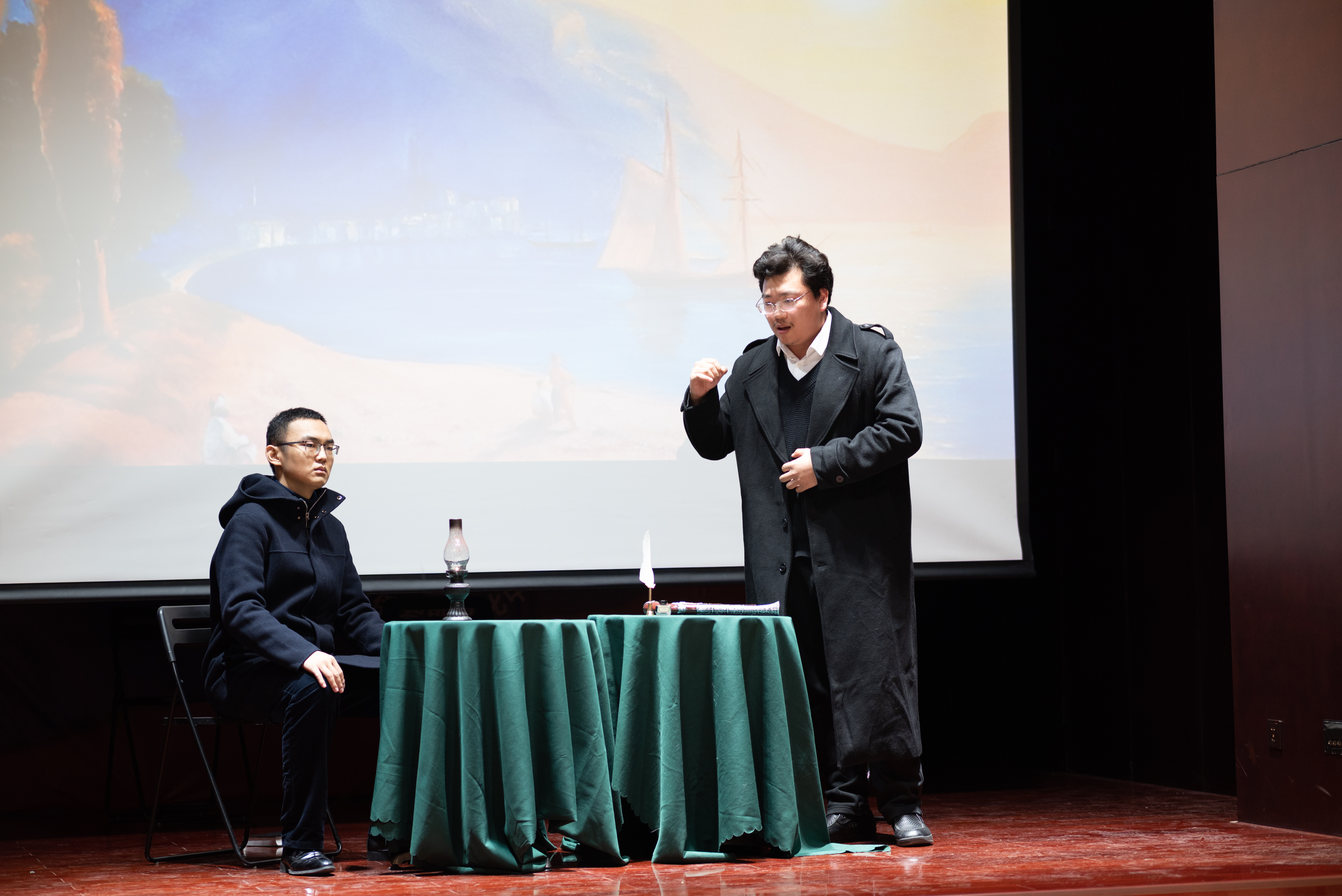 由博鱼网页版俄罗斯语言文学系同学排演的三幕话剧«Раскольник и др.»(《拉斯柯尔尼科夫一众》)是本次活动的第五个节目。整部剧时长约十六分钟,《地下室手记》《罪与罚》《群魔》《荒唐人的梦》《卡拉马佐夫兄弟》中的主人公们轮番登场,他们在惶恐焦虑、急切不安的状态下爆发,以难以遏制的激情直抒胸臆。通过他们的表演,观众可以理解陀氏人物的内心世界,体会他们在思想上的传承、在观念上的碰撞。每幕仅五六分钟的话剧,布景道具要而不繁,汇聚传统手法和现代风尚,有力呈现了陀氏作品的精神内涵。