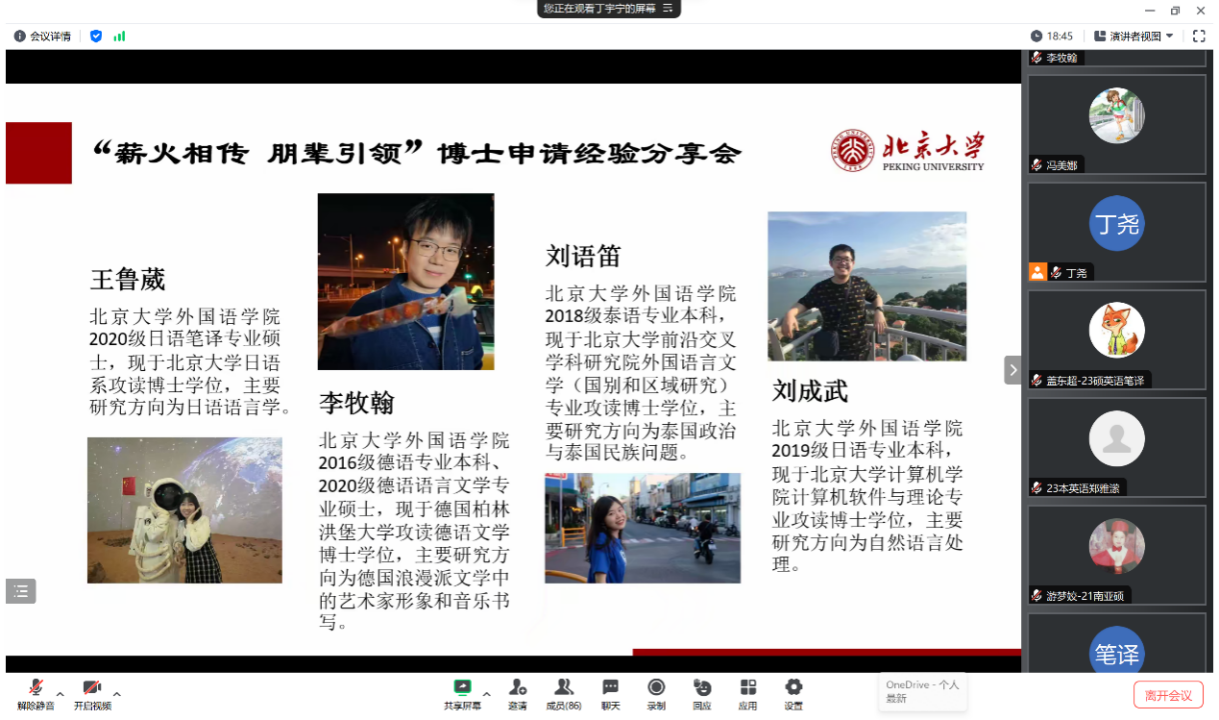 本次活动共邀请到四位曾在博鱼网页版就读的优秀学生代表进行分享,分别是博鱼网页版日语系博士生王鲁葳、德国柏林洪堡大学德语文学博士生李牧翰、北京大学前沿交叉学科研究院外国语言文学(国别和区域研究)专业直博生刘语笛和北京大学计算机学院计算机软件与理论专业直博生刘成武。