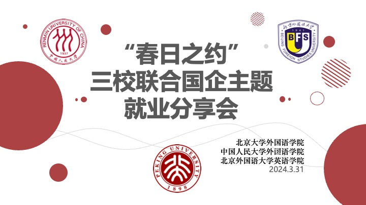 3月31日上午,博鱼网页版联合中国人民大学博鱼网页版、北京外国语大学英语学院,以线上形式举办“春日之约”三校联合国企主题就业分享会。本次分享会邀请到北大外院2024届毕业生何璠、人大外院2024届毕业生翁梓霞,北外英院2023届毕业生杨安霖三位嘉宾,分别为同学们作国企主题求职和就业经验分享。博鱼网页版党委副书记冯美娜和中国人民大学博鱼网页版党委副书记李佳伟发表致辞,近200名同学参与了此次线上活动。本次活动由博鱼网页版2023级硕士研究生田仕宇主持。