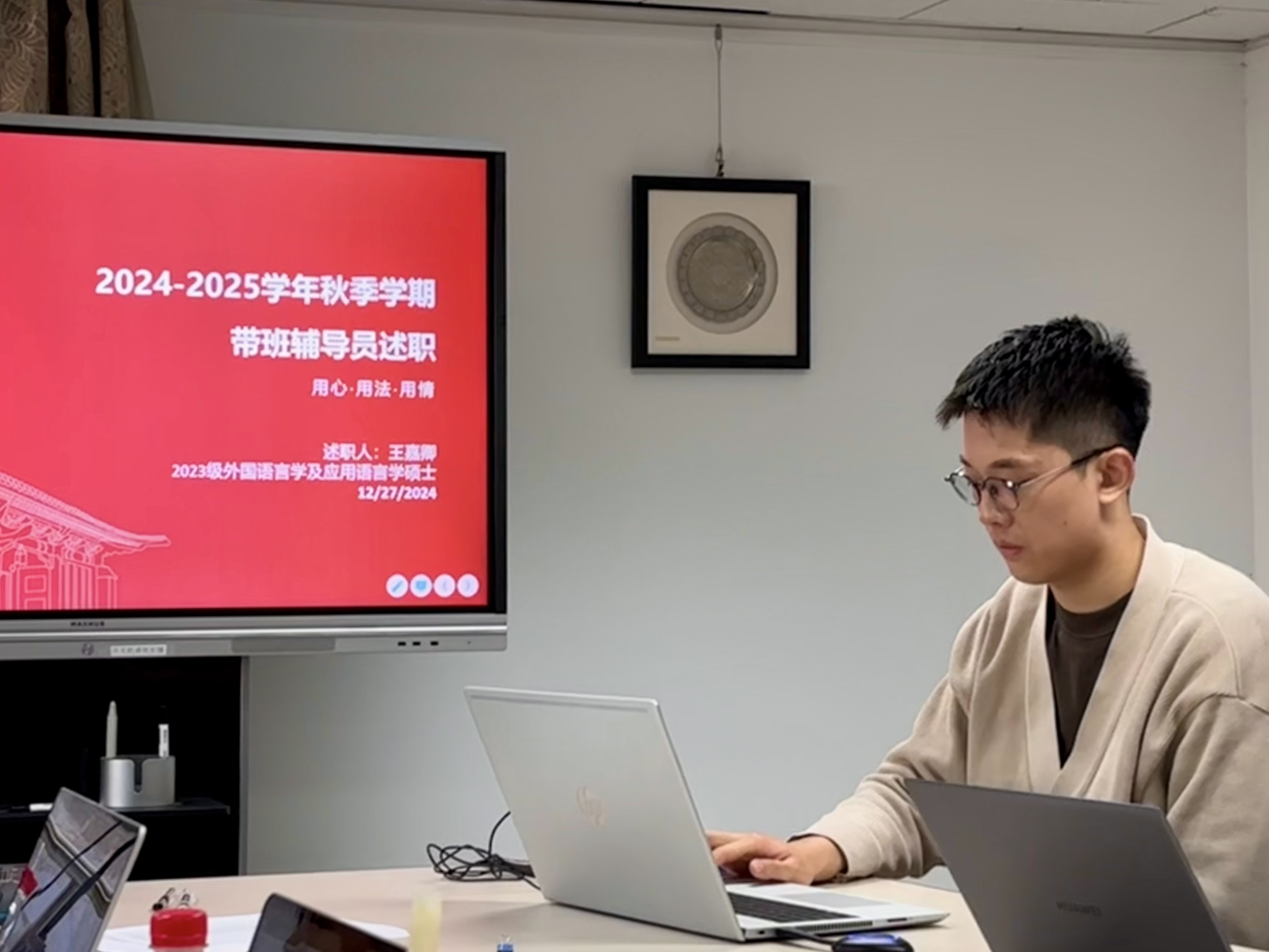 首先,带班辅导员依次进行述职。他们分别介绍了所带班级的基本情况,总结了本学期开展谈心谈话、参加班团活动、参与心理技能培训等工作内容,展示了个人的特色创新工作。同时,带班辅导员们也对寒假和春季学期的工作做出了规划与展望,包括优化工作思维,凸显思政引领价值;立足同学所需,持续做好深度辅导;注重示范引领,创新集体活动形式;加强朋辈交流,推动带班辅导员之间的互动学习等。