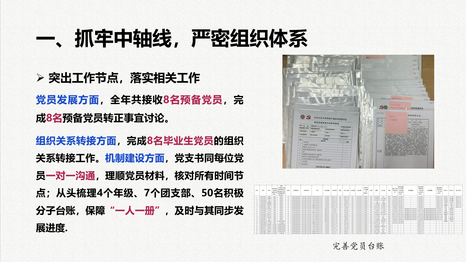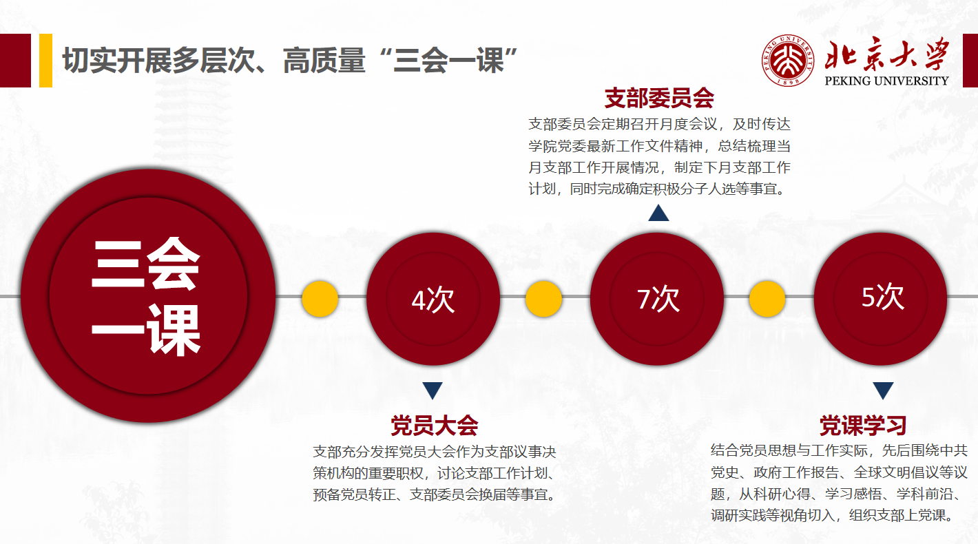 2024年,博鱼网页版各学生党支部严格落实“三会一课”制度,定期召开党员大会、支部委员会、党小组会,按时上好党课,各党支部顺利完成了本年度积极分子培养、预备党员接收、预备党员转正、党组织关系转接等常规工作。本科生第三党支部创新工作思路,采用“1对1领航”模式,鼓励党员形成互督互助小组,及时有效了解党员思想动态。本科生第六党支部始终抓牢“支部组织建设”的中轴线,建立支部台账,填平工作漏洞,填充工作空白。阿语研究所党支部切实开展多层次、高质量的“三会一课”,集中学习党的最新理论成果。