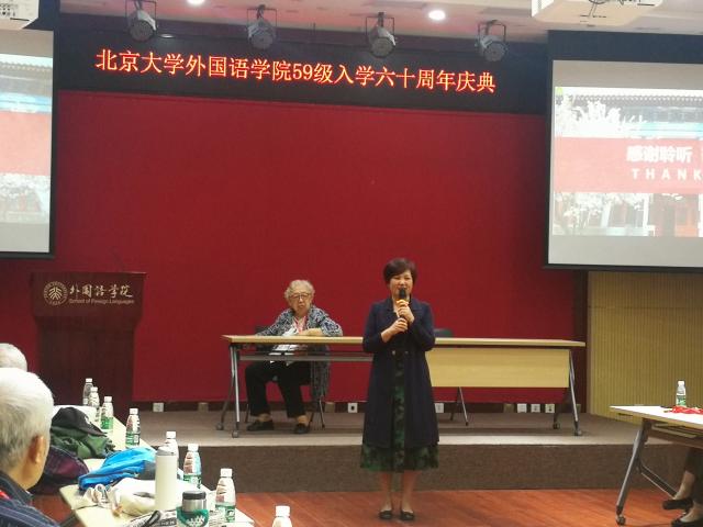 庆典由德语系系友汪葆卿女士主持,博鱼网页版党委书记李淑静出席了本次庆祝活动。李老师首先欢迎近四十位八十高寿的英德法三专业系友到来,还为校友介绍了北大外院的历史与现状。李老师也是英语系系友,是老西语系招收的最后一届英语专业本科生,因此今天的聚会对她本人也意义非同寻常——不仅见到了曾经的英语系老师,也重逢了她的二外德语老师。李老师通过PPT为院友们展示了外院近年来取得的骄人成绩。院友们对外院在立德树人和教学科研方面取得的成就深表赞赏。