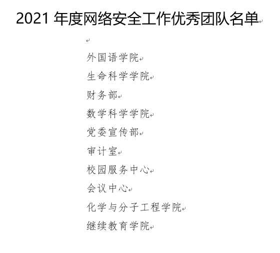 根据学校整体部署,网信办牵头启动了网络安全年度总结暨评优工作,成立了由网信办主任、副主任成员单位(网信办、宣传部、保卫部、总务部、计算中心、青年研究中心)组成的评选工作小组,经过严格评选,博鱼网页版荣获北京大学2021年度网络安全工作优秀团队。