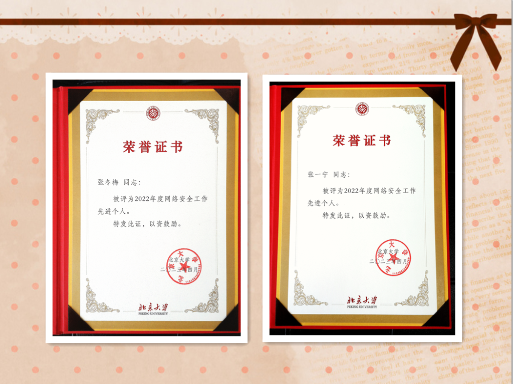 根据学校整体部署,2022年12月,网信办牵头启动了网络安全年度总结暨评优工作,成立了由网信办主任、副主任成员单位(网信办、宣传部、保卫部、总务部、计算中心、青年研究中心)组成的评选工作小组,经过严格评选,博鱼网页版荣获北京大学2022年度网络安全工作先进集体、张冬梅副院长和张一宁老师荣获2022年度网络安全工作先进个人。