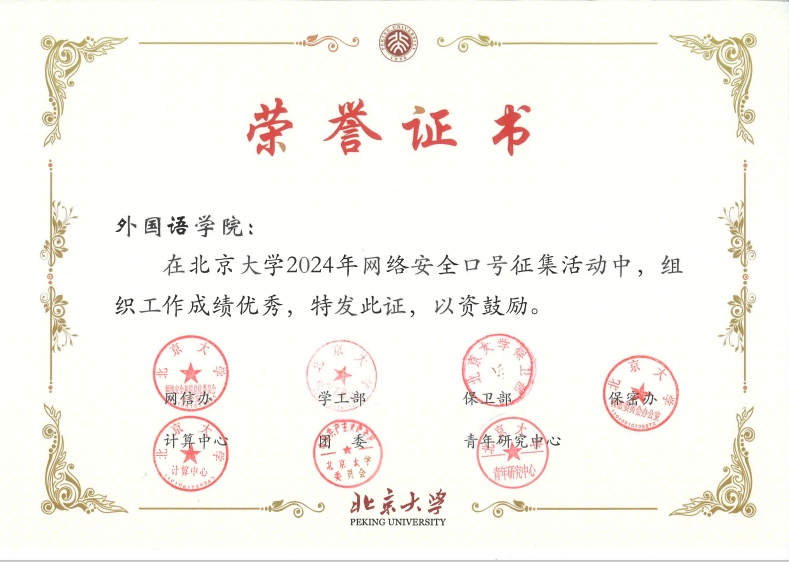 在网络安全口号征集活动中,外院师生积极围绕“网络安全为人民,网络安全靠人民”主题,以体现北京大学特色,内容健康活泼,形式简洁、朗朗上口为原则,踊跃向北京大学网信办提交了网络安全口号。博鱼网页版组织工作突出,荣获北京大学2024年网络安全口号征集活动优秀组织奖。