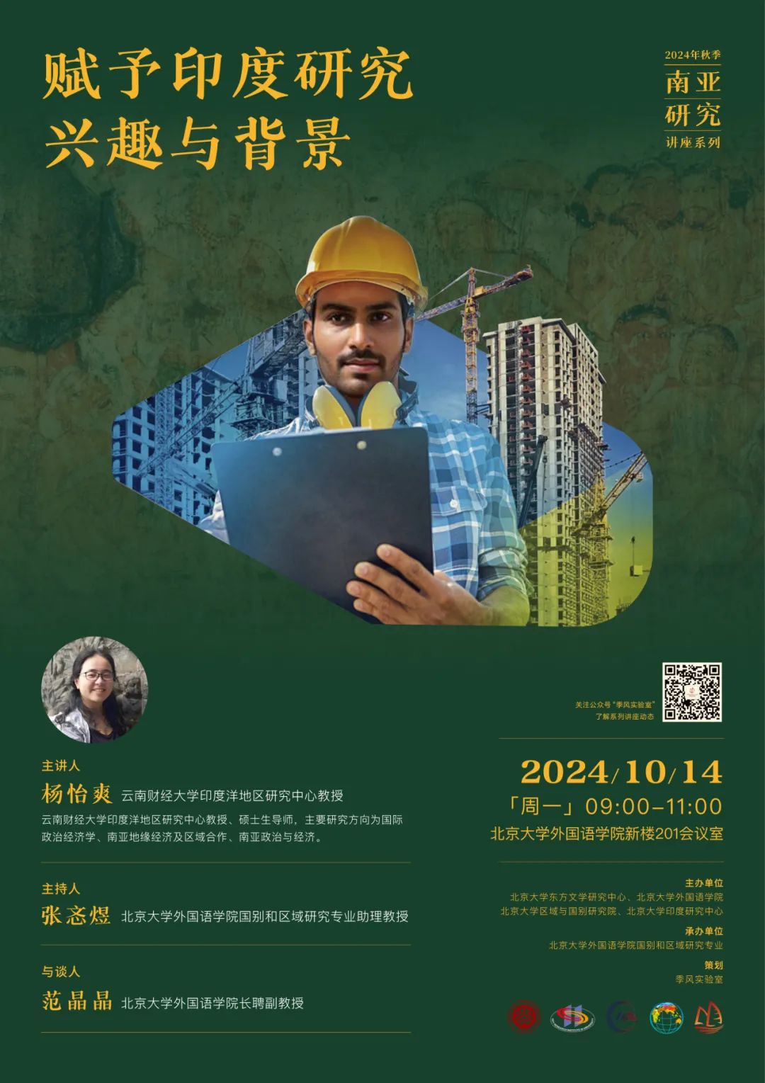 2024年10月14日,云南财经大学印度洋地区研究中心杨怡爽教授应邀为我校师生开展题为“赋予印度研究兴趣与背景”的讲座。本次讲座是由北京大学东方文学研究中心、博鱼网页版、区域与国别研究院和印度研究中心主办,博鱼网页版国别和区域研究专业承办的2024年秋季学期南亚研究系列讲座的第二讲。讲座由博鱼网页版国别和区域研究专业助理教授张忞煜主持,博鱼网页版长聘副教授范晶晶参与讨论。