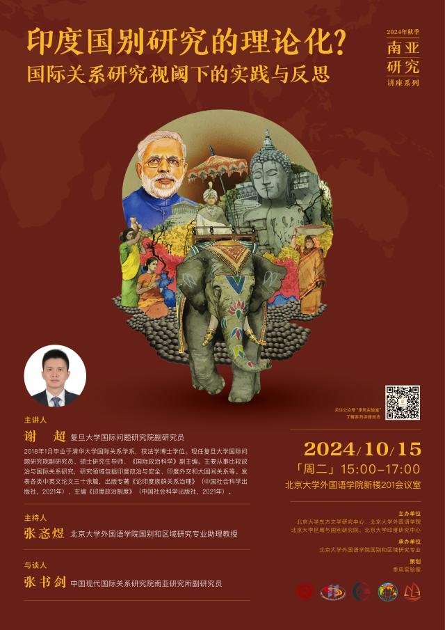 2024年10月15日,复旦大学国际问题研究院谢超副研究员应邀为我校师生开展题为“印度国别研究的理论化?——国际关系研究视阈下的实践与反思”的讲座。本次讲座是由北京大学东方文学研究中心、博鱼网页版、区域与国别研究院和印度研究中心主办,博鱼网页版国别和区域研究专业承办的2024年秋季学期南亚研究系列讲座的第三讲。讲座由博鱼网页版助理教授张忞煜主持,中国现代国际关系研究院南亚研究所副研究员张书剑、中国人民大学国际关系学院副教授曹德军参与讨论。