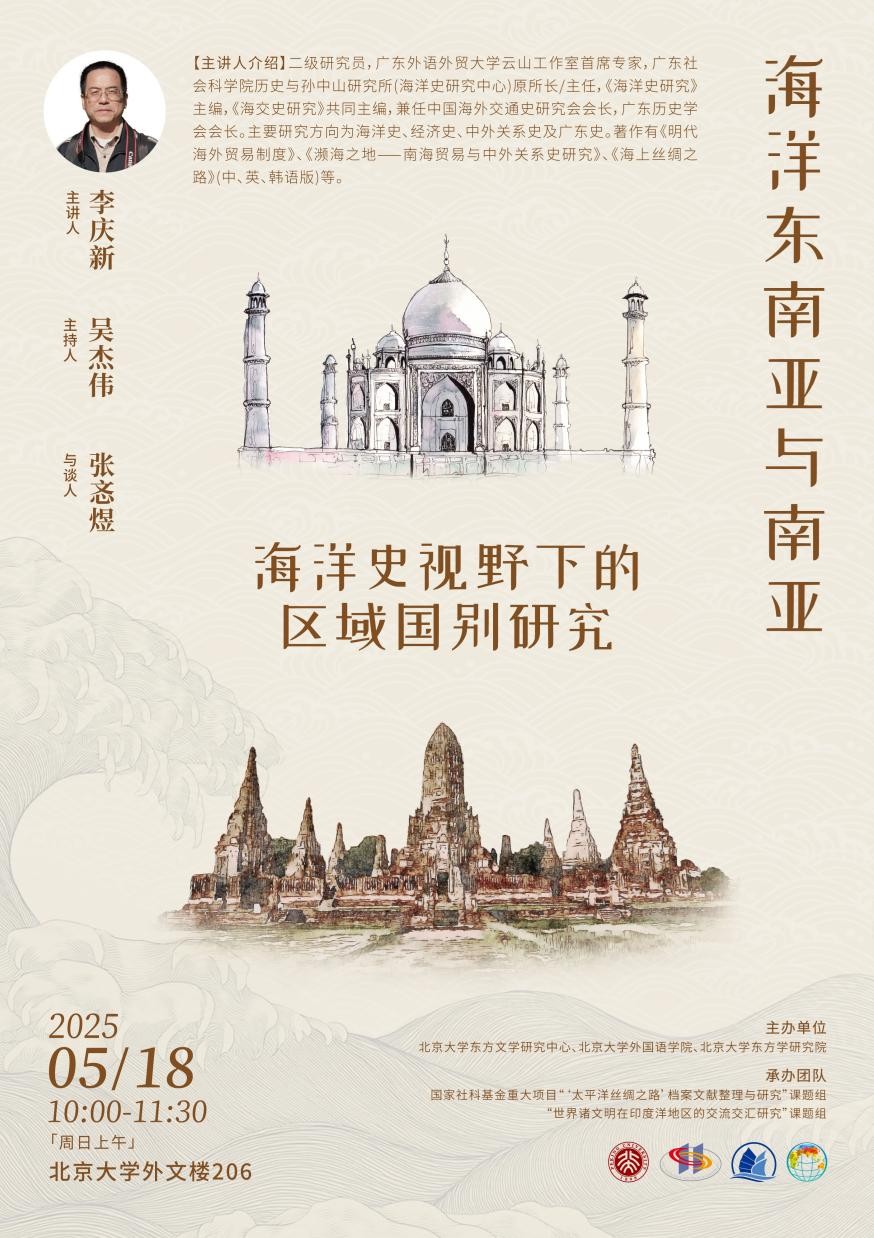 2025年5月18日上午,广东外语外贸大学云山工作室首席专家,二级研究员李庆新教授为北京大学师生做了主题为“海洋东南亚与南亚——海洋史视野下区域国别研究思考”的讲座。本次讲座由北京大学东方文学研究中心、博鱼网页版、北京大学东方学研究院主办,“‘太平洋丝绸之路’档案文献整理与研究”课题组和“世界诸文明在印度洋地区的交流交汇研究”课题组联合承办。讲座由吴杰伟教授主持,张忞煜助理教授参与讨论。